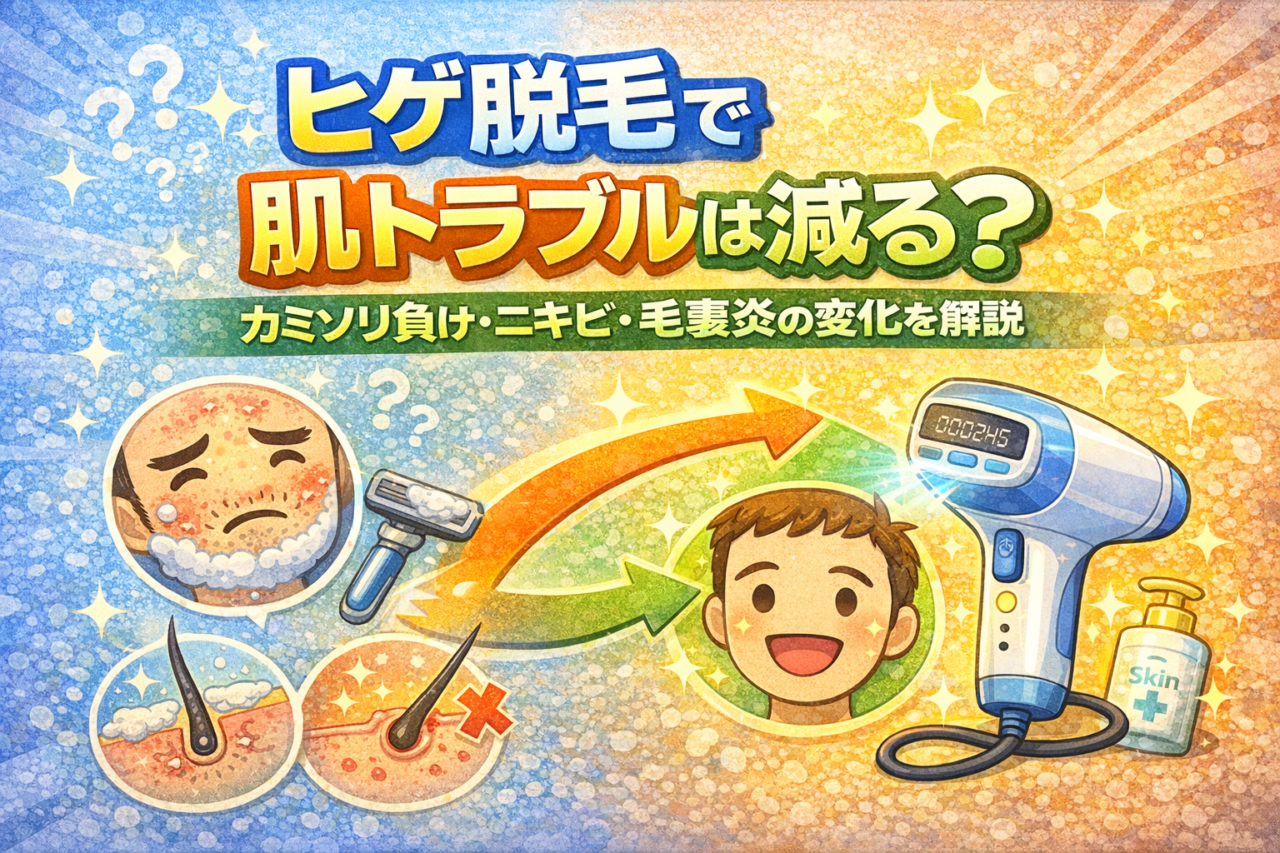 カミソリ負けは、刺激の累積で悪化します。毎日剃っていると、皮膚が回復する時間がなく、慢性的に炎症が続きます。脱毛で毛量が減れば、刺激の頻度が下がり、皮膚が回復する時間が生まれます。