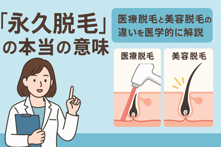 “永久脱毛=一生毛が生えない”は誤解? 「永久脱毛」という言葉、誰しも一度は耳にしたことがあるのではないでしょうか?特に医療脱毛クリニックや美容サロンの広告では、「永久脱毛できます」「ツルツル肌をずっとキープ」などと書かれていることが多く見受けられます。 しかし実は、永久脱毛に“二度と毛が生えてこない”という意味はありません。この誤解が原因で、期待とのギャップにがっかりしたり、トラブルにつながるケ […]