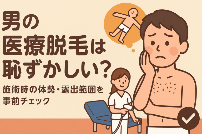 男の医療脱毛は恥ずかしい?施術時の体勢・露出範囲を事前チェック 「医療脱毛を受けたいけど、恥ずかしくて踏み出せない…」そんな悩みを抱える男性は非常に多いです。特にVIOや全身脱毛では、**“どこまで見られるのか”**という不安がブレーキになりますよね。 この記事では、医療脱毛の施術時に取る体勢や見られる範囲、スタッフの対応や恥ずかしさを減らすコツまで詳しく紹介していきます。恥ずかしさで二の足を踏ん […]